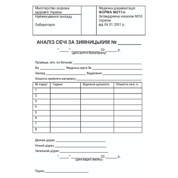 Формат картки - А6 (10,5 х 14,8 см.)Кольоровість друку - чорно-біла.Скріплення - немає.Білий офсетний папір щільністю 70-80 г / м.Бланк форми 211/о «Аналіз сечі за Зимницьким» відповідає наказу МОЗ №1 від 04.01.2001 р... Детальніше...