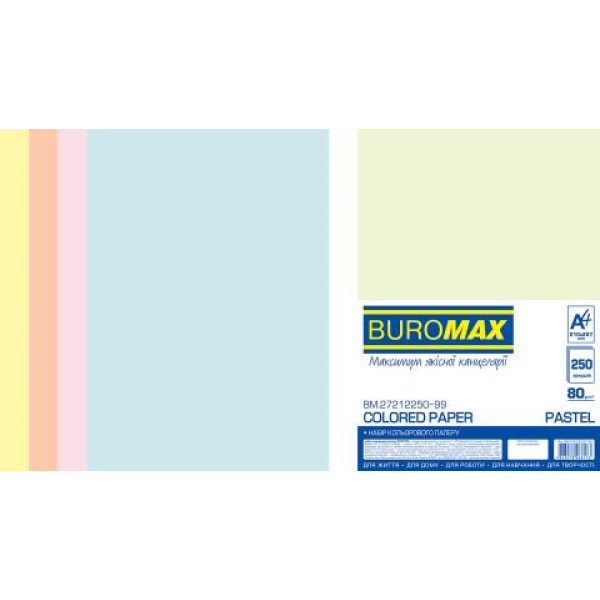 Папір кольоровий А4 80 г/м кв BUROMAX Райдуга 250 арк PASTEL 5 кольорів (BM.27212250E-99)