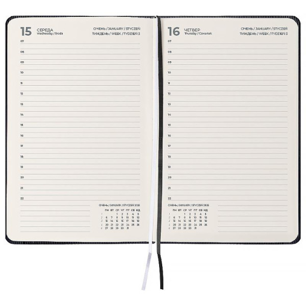 Тверда обкладинка допомагає зберегти акуратний та презентабельний вигляд протягом довгого часу. Якісний кремовий папір щільністю 80 г/м2 добре вбирає чорнило та забезпечує комфортне письмо. Зручно робити записи, креслити та малювати. Щоденник має датований блок у лінію на кожний день .