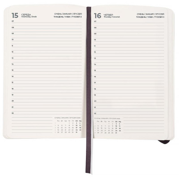 Внутрішній блок українською мовою. Щоденник містить календар на 2026-2027 рік, загальний тижневий розклад, інформацію про свята, важливі номери телефонів, часові пояси країн світу, одиниці вимірювання, шкалу температур.