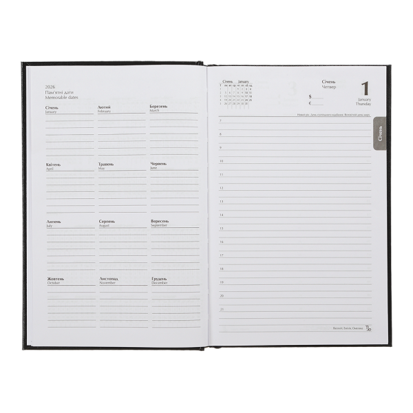 Датована сторінка з організатором часу з 7:00 до 21:00, календарем на поточний/наступний місяць, позначенням дня тижня, знаку зодіаку, іменинників