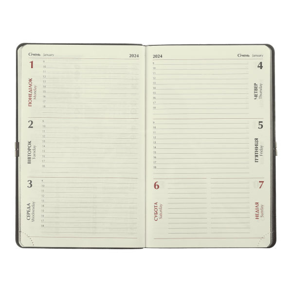 На одній сторінці горизонтально розміщено три/чотири дні тижня (субота і неділя - вертикальне розташування на одній частині), з організатором часу від 9:00 до 18:00, вказівкою місяця, року, дня тижня та дати