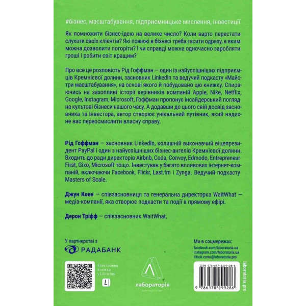 Ключем до масштабування бізнесу є не талант чи стратегія, а підприємницьке мислення, яке можна (і треба) розвивати. У цьому впевнений Рід Гофман - один із найуспішніших підприємців Кремнієвої долини, засновник LinkedIn та ведучий подкасту "Майстри масштабування", на основі якого і побудована ця книжка. У ній вміщені інтерв`ю із лідерами знакових компаній, включаючи Apple, Nike, Netflix, Spotify, Starbucks, Google, Instagram і Microsoft, а також з тими підприємцями, які тільки розпочинають свій шлях, але вже встигли гучно заявити про себе сміливими стартапами: 23andMe, TaskRabbit, Black List і Walker&Co. Додаючи до цього власний досвід засновника та інвестора, Рід Гофман створює унікальний посібник, який надихне вас переосмислити власну справу. Завдяки захопливому сторітелінгу та глибокому аналізу, книжка "Майстри масштабування" розвінчує найпоширеніші міфи про бізнес та ділиться дивовижними істинами, дотримуючись яких можна створити унікальний продукт, який зробить світ кращим.
