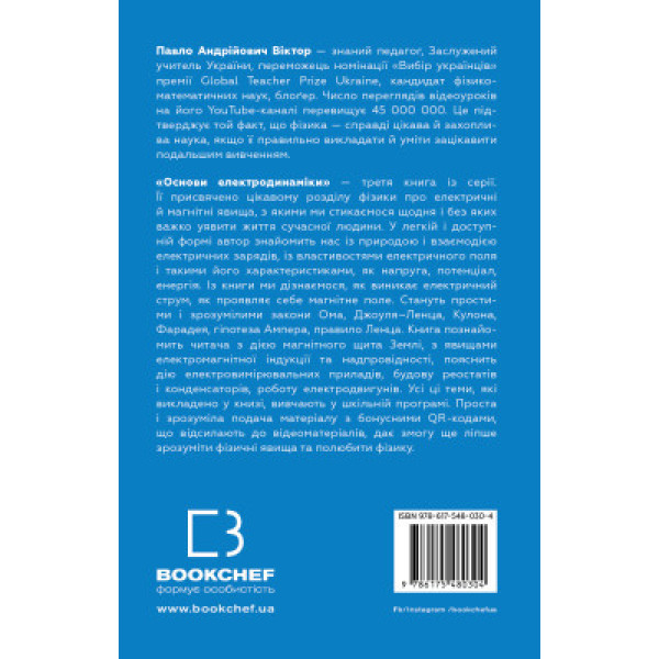 «Основи електродинаміки» — третя книга із серії. Її присвячено цікавому розділу фізики про електричні й магнітні явища, з якими ми стикаємося щодня і без яких важко уявити життя сучасної людини. У легкій і доступній формі автор знайомить нас із природою і взаємодією електричних зарядів, із властивостями електричного поля і такими його характеристиками, як напруга, потенціал, енергія. Із книги ми дізнаємося, як виникає електричний струм, як проявляє себе магнітне поле. Стануть простими і зрозумілими закони Ома, Джоуля–Ленца, Кулона, Фарадея, гіпотеза Ампера, правило Ленца. Книга познайомить читача з дією магнітного щита Землі, з явищами електромагнітної індукції та надпровідності, пояснить дію електровимірювальних приладів, будову реостатів і конденсаторів, роботу електродвигунів. Усі ці теми, які викладено у книзі, вивчають у шкільній програмі. Проста і зрозуміла подача матеріалу з бонусними QR-кодами, що відсилають до відеоматеріалів, дає змогу ще ліпше зрозуміти фізичні явища та полюбити фізику.