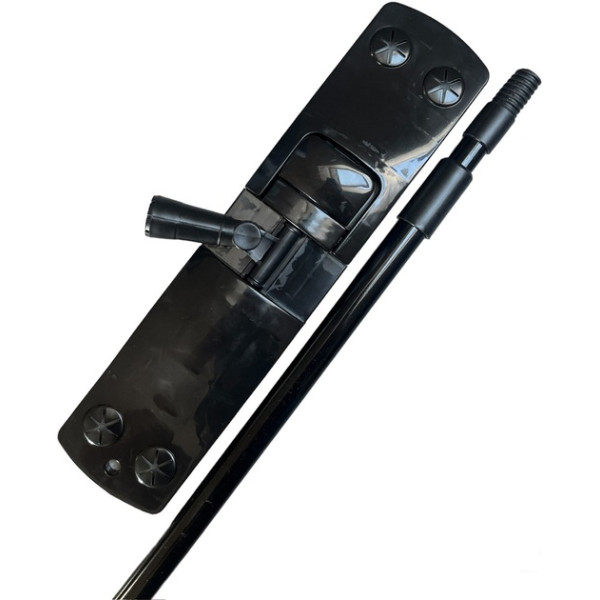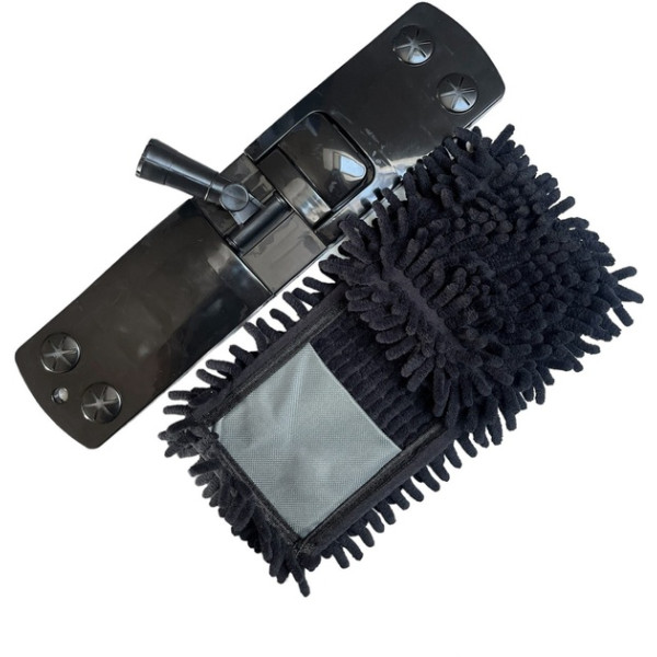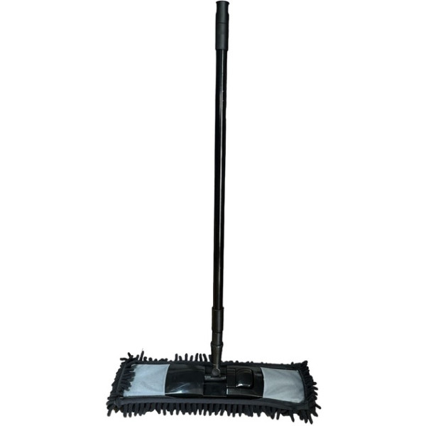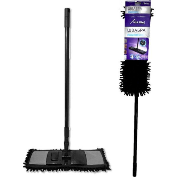 Швабра чорна, 70*120 см, торгова марка «Мій Дім», насадка з мікрофібри (шеніл). Швабра AH07263/B з насадкою з мікрофібри допоможе з легкістю створити ідеальну чистоту в домі за лічені хвилини. Універсальна міцна телескопічна ручка виготовлена з металу. Зручне регулювання висоти від 76 см до 124 см. Кріплення ручки виготовлене з міцного довговічного пластика, на верхньому краї ручки встановлений пластиковий ковпачок з кільцем для підвішування на гачок. Основа для пласких мопів розміром 40*10 см, виготовлена з міцного, стійкого до ударів та напвантажень пластика, має педаль для зручного складання, оснащена шарнірним з`єднанням, що забезпечує хороший контакт мопа з поверхнею, і забезпечує свободу рухів шваброю, для ретельного прибирання у важкодоступних місцях. Запаска з мікрофібри призначена для миття всіх типів підлогового покриття, в тому числі й дерев`яної підлоги, не залишає розводів.