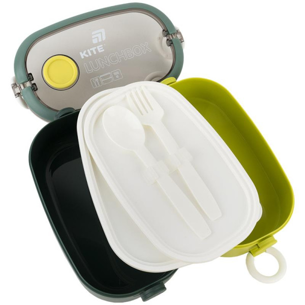 У комплекті є пластикова ложка та виделка, зручно зафіксовані всередині.
