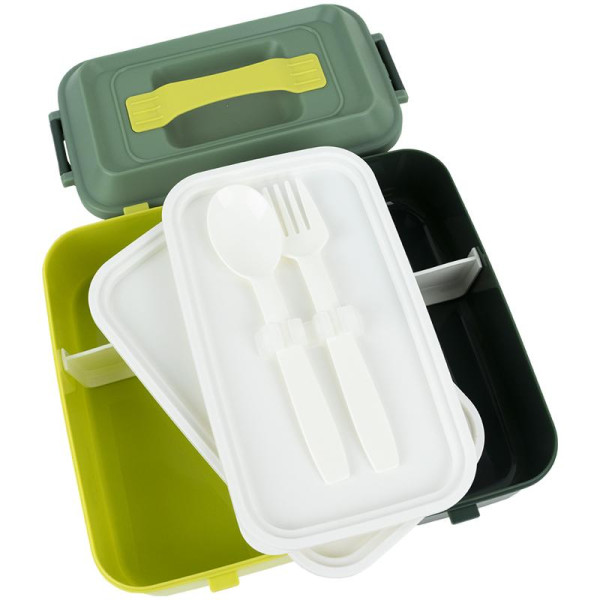 У комплекті — пластикова ложка та виделка, зручно зафіксовані всередині.