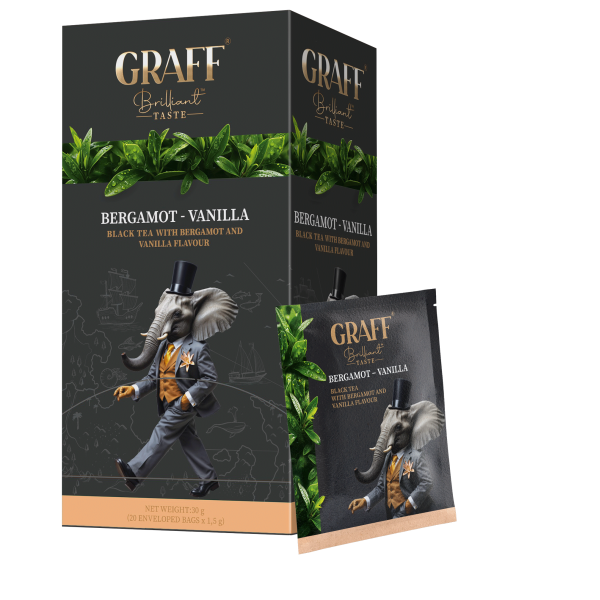 Чай чорний GRAFF "Бергамот і Ваніль" Фасування: 30 г (20 сашетів по 1,5 г) Вишуканий купаж чорного чаю, доповнений ніжними нотками ванілі та витонченим ароматом бергамоту. Напій дарує гармонійне поєднання пряної свіжості... Детальніше...
