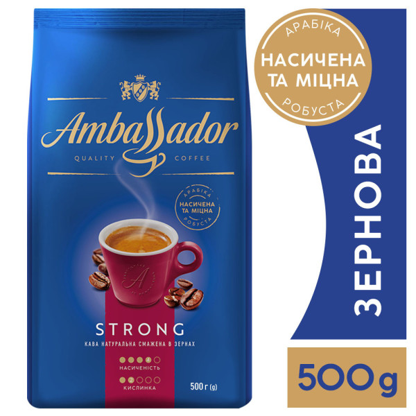 Кава в зернах Ambassador Strong - композиція зерен темної обсмажування з виразним смаком з нотками темного шоколаду, прянощів, горіхів та медової насолоди. Арабіка наповнює кавовий букет ароматом, тоді як робуста робить ... Детальніше...