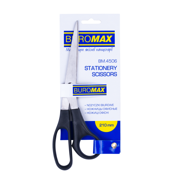 Офісні ножиці BUROMAX: підходять для різання паперу, картону, фотопаперу, тканини і т.д.. У ножиць плавний і м'який хід різання, закруглені леза виготовлені з нержавіючої сталі, і гарантують безпеку під час різання. Ручк... Детальніше...