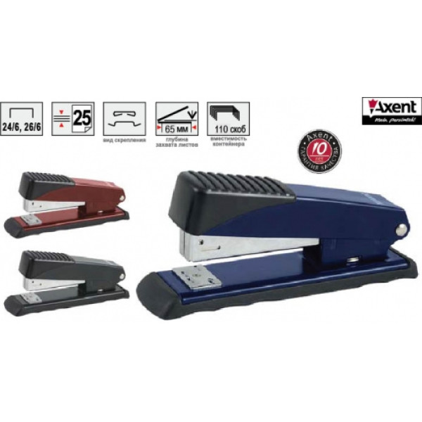 Степлер металевий серії Exakt-2. Скоба №24/6. Потужність до 25 аркушів. Глибина скріплення 65мм. Колір: чорний, червоний, синій, Картонна упаковка. Степлер Axent Exakt-2 належить до металевої серії, міцний металевий кор... Детальніше...