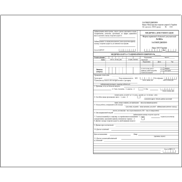 Формат карточки — А4, книжный (21 х 29,7 см.)Цветность печати — черно-белая.Скрепление — скобы.Белая офсетная бумага плотностью 70-80 г/м.Бланк формы 003/о “Медицинская карта стационарного больного № __” соответствует п... Читать далее...