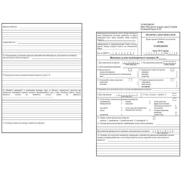 Формат карточки — А4х2 (21 х 29,7 см.)Цветность печати — черно-белая.Скрепление — нет.Белая офсетная бумага плотностью 70-80 г/м.Бланк формы 100/о «Висновок судово-психіатричного експерта» соответствует приказу МОЗ №52... Читать далее...