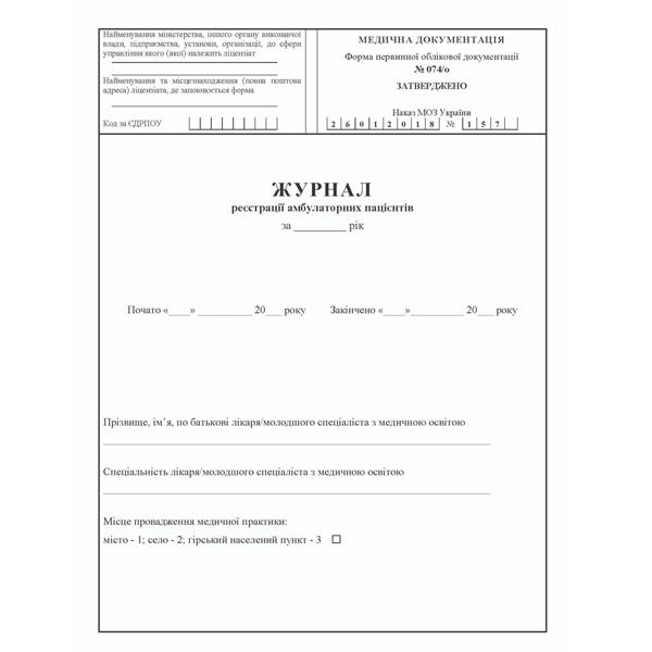 Бланк формы Форма № 074/о “Журнал реєстрації амбулаторних пацієнтів” соответствует приказу МОЗ №157 от 26.01.2018 г.