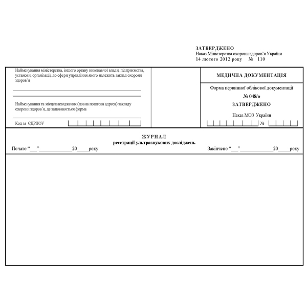 Форма № 048/о «Журнал реєстрації ультразвукових досліджень» соответствует приказу МОЗ №110 от 14.02.2012 г.