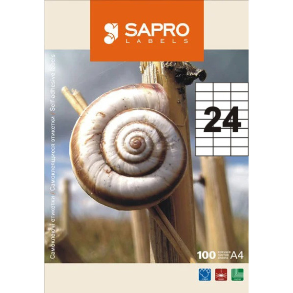SAPRO labels - самоклеящиеся этикетки европейского качества.Подходят для печати на лезерных, струйных принтерах и копировальных аппаратах.- плотность бумаги 70 гр/м2- упаковка 100 листов, А4- Размер наклейки (фрагмента):... Читать далее...