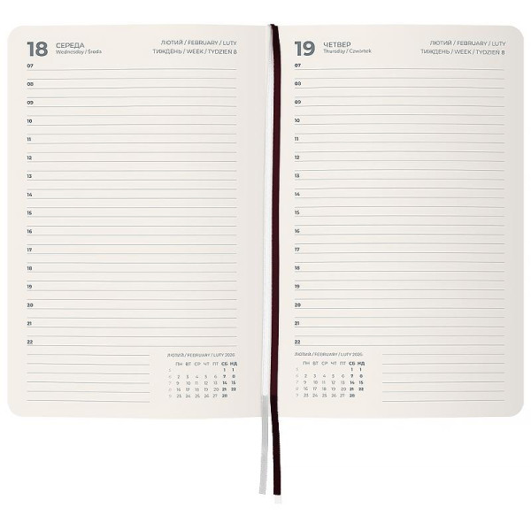 Внутренний блок на украинском языке. Ежедневник содержит календарь на 2026-2027 год, общий недельный распорядок, информацию о праздниках, важные телефонные номера, часовые пояса стран мира, единицы измерения, шкалу температур.