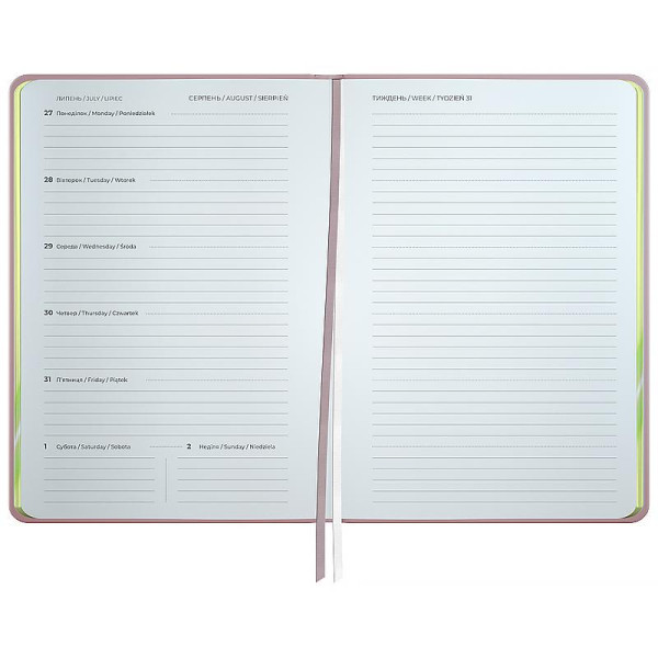 Твердая обложка помогает сохранить аккуратный и презентабельный вид на протяжении долгого времени. Качественная кремовая бумага плотностью 80 г/м2 хорошо впитывает чернила и обеспечивает комфортное письмо. Удобно делать записи, чертить и рисовать. Ежедневник имеет датированный блок в линейку на каждый день.