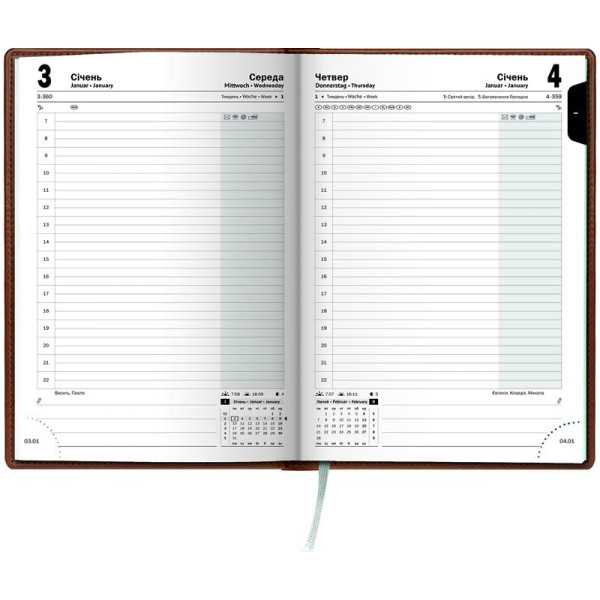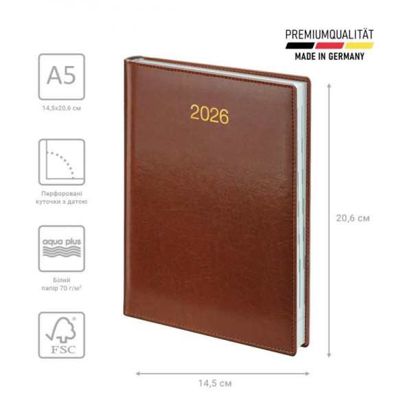 Датированный ежедневник BRUNNEN 2026 Стандарт — стильная классическая модель. Оптимизированное пространство для записей и удобная навигация. Особенности: Три языка: украинский, английский, немецкий. Общее количество страниц – 336. Одна страница – один день. Организатор времени с 07:00 до 22:00. Качественная печать в сером цвете. 4 страницы для общего планирования на год. Расширенный информационный блок. Белая европейская бумага 70 г/м2. Закладка-ляссе и отрывные уголки с датой. Стильная обложка Soft. Золотое тиснение.