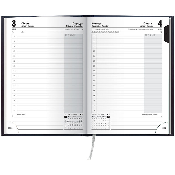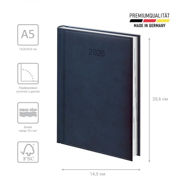 Датированный ежедневник BRUNNEN 2026 Стандарт — стильная классическая модель. Оптимизированное пространство для записей и удобная навигация. Особенности: Три языка: украинский, английский, немецкий. Общее количество страниц – 336. Одна страница – один день. Организатор времени с 07:00 до 22:00. Качественная печать в сером цвете. 4 страницы для общего планирования на год. Расширенный информационный блок. Белая европейская бумага 70 г/м2. Закладка-ляссе и отрывные уголки с датой. Стильная обложка Torino. Слепое тиснение.
