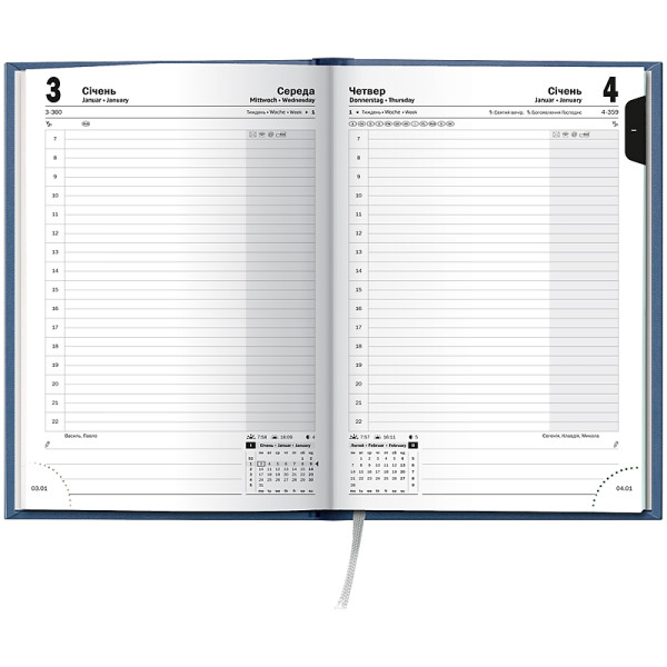 Датированный ежедневник BRUNNEN 2026 Стандарт — стильная классическая модель. Оптимизированное пространство для записей и удобная навигация. Особенности: Три языка: украинский, английский, немецкий. Общее количество страниц – 336. Одна страница – один день. Организатор времени с 07:00 до 22:00. Качественная печать в сером цвете. 4 страницы для общего планирования на год. Расширенный информационный блок. Белая европейская бумага 70 г/м2. Закладка-ляссе и отрывные уголки с датой. Стильная обложка Torino Trend. Слепое тиснение.