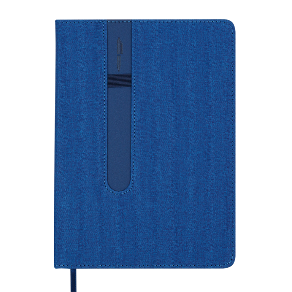 Жесткая обложка из искусственной кожи с поролоном ежедневника ELEGANTE выполнена в лаконичном и функциональном дизайне, который сочетает материал с фактурой ткани и вставку из гладкой кожи. Ежедневник имеет петлю для размещения ручки. Элементы отделки – слепое тиснение отпечатка ручки, который как-бы указывает на возможность закрепить ее на обложке, и декоративный шов по периметру и на стыке фактур. Гармонично дополняет дизайн нанесения года на срезе внутреннего блока.