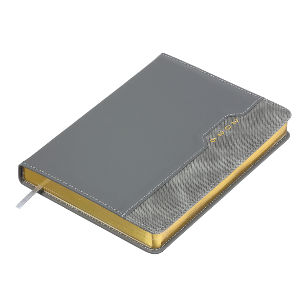 Жесткая обложка ежедневника INFINITI изготовлена из искусственной кожи, с поролоном, в сочетании гладкого и фактурного материала. Еще большую оригинальности и особенности придает ежедневнику декоративный шов по периметру обложки и на стыке разных видов кожи, а также тиснение золотом года. Гармонично дополняет дизайн тонированный золотым цветом срез внутреннего блока.
