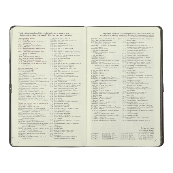 Информационно-справочный блок: национальные, религиозные, профессиональные праздники и памятные даты, знаки зодиака, телефонные коды мобильных операторов и областных центров Украины, буквенные автомобильные коды стран, таблица расстояний между областными центрами Украины, справочник систем измерения, международные знаки соответствия, знаки ухода за одеждой