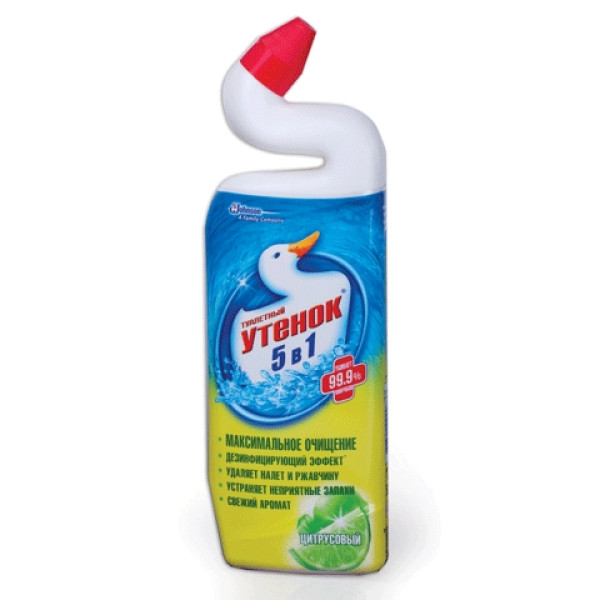 Чистящее средство Туалетный утенок 5 в 1 Цитрусовая свежесть 500 мл (4823002000733) предназначен для мытья унитазов и обеспечивает максимальное очищение, дезинфицирующий эффект — убивает 99,9% микробов, удаление налета и ржавчины, устранение неприятных запахов, свежий аромат. Благодаря уникальной форме горлышка Туалетный утенок лучше попадает в труднодоступные места скопления бактерий под ободком унитаза.