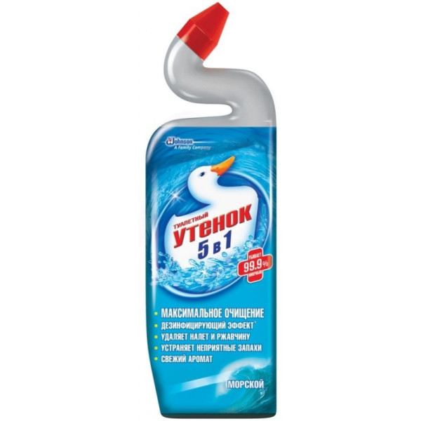 Чистящее средство Туалетный утенок 5 в 1 Морская свежесть 500 мл (4823002000719) предназначен для мытья унитазов и обеспечивает максимальное очищение, дезинфицирующий эффект — убивает 99,9% микробов, удаление налета и ржавчины, устранение неприятных запахов, свежий аромат. Благодаря уникальной форме горлышка Туалетный утенок лучше попадает в труднодоступные места скопления бактерий под ободком унитаза.