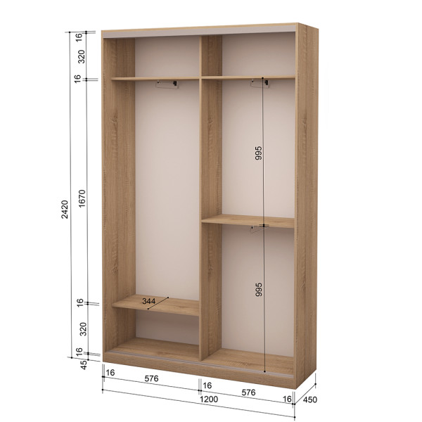 Шкаф-купе ROKO – вместительный, компактный и недорогой элемент вашего интерьера, отличающийся особой функциональностью и эргономичностью. Корпус шкафа-купе ROKO изготовлен из прочной ламинированной ДСП толщиной 16мм, ДСП фасады – 10мм. Шкаф устанавливается на регулируемые ножки, которые позволяют выставить шкаф ровно. Внешние детали закромкованы ПВХ 2 мм, полки и ящики – о,5мм. Раздвижная система в цвете серебро. В комплекте предусмотрены стоевые, крыша, дно, внутреннее наполнение (полки, трубы), направляющие, двери и комплект фурнитуры. Шкаф отгружается в разобранном виде, однако в комплекте есть инструкция по сборке, которая упростит задачу и сборщикам с опытом, и тем, кто никогда ранее не сталкивался со сборкой мебели. Прямо в каталоге у вас есть возможность подробно выбрать наружное оформление (цвет, фасады), конфигурацию (наполнение) и габариты шкафа-купе. Благодаря универсальной заводской присадке во время установки вы можете изменить расположение внутреннего наполнения – изменить его зеркально или увеличить/уменьшить расстояние между элементами. Полки устанавливаются с шагом в 320мм. Общая высота шкафа 242 см. Любой шкаф можно доукомплектовать приставным радиусным элементом и ящичным блоком. Для этого необходимо приобрести товар подходящего размера отдельно в каталоге. Выдвижные ящики можно монтировать между любыми двумя полками шкафа. Шкаф отгружается в разобраном и упакованном виде. Упаковка - гофрокартон. В комплекте: крыша, дно, боковые стойки, задняя стенка ДВП, комплект фурнитуры, детали для внутреннего наполнения, фасады, инструкция по сборке.