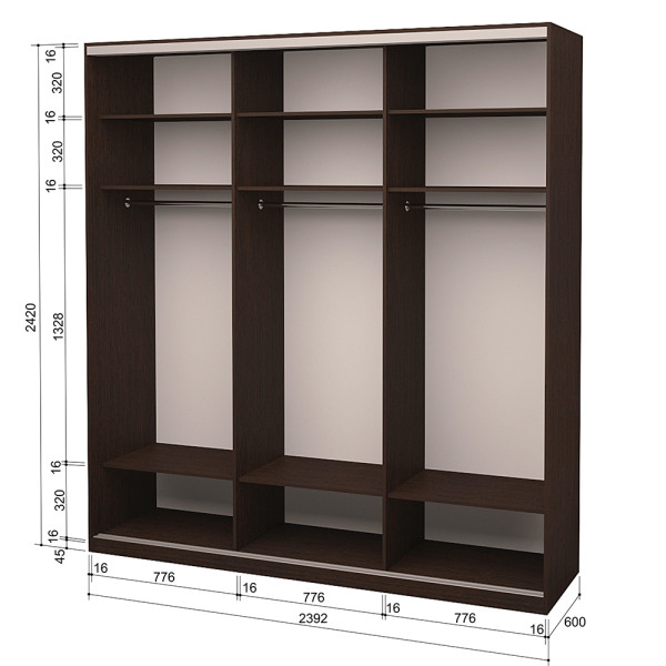 Шкаф-купе ROKO – вместительный, компактный и недорогой элемент вашего интерьера, отличающийся особой функциональностью и эргономичностью. Корпус шкафа-купе ROKO изготовлен из прочной ламинированной ДСП толщиной 16мм, ДСП фасады – 10мм. Шкаф устанавливается на регулируемые ножки, которые позволяют выставить шкаф ровно. Внешние детали закромкованы ПВХ 2 мм, полки и ящики – о,5мм. Раздвижная система в цвете серебро. В комплекте предусмотрены стоевые, крыша, дно, внутреннее наполнение (полки, трубы), направляющие, двери и комплект фурнитуры. Шкаф отгружается в разобранном виде, однако в комплекте есть инструкция по сборке, которая упростит задачу и сборщикам с опытом, и тем, кто никогда ранее не сталкивался со сборкой мебели. Прямо в каталоге у вас есть возможность подробно выбрать наружное оформление (цвет, фасады), конфигурацию (наполнение) и габариты шкафа-купе. Благодаря универсальной заводской присадке во время установки вы можете изменить расположение внутреннего наполнения – изменить его зеркально или увеличить/уменьшить расстояние между элементами. Полки устанавливаются с шагом в 320мм. Общая высота шкафа 242 см. Любой шкаф можно доукомплектовать приставным радиусным элементом и ящичным блоком. Для этого необходимо приобрести товар подходящего размера отдельно в каталоге. Выдвижные ящики можно монтировать между любыми двумя полками шкафа. Шкаф отгружается в разобраном и упакованном виде. Упаковка - гофрокартон. В комплекте: крыша, дно, боковые стойки, задняя стенка ДВП, комплект фурнитуры, детали для внутреннего наполнения, фасады, инструкция по сборке.