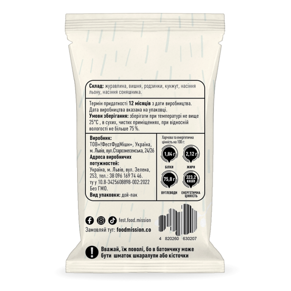 Батончик клюквенно-вишневый 40г Food Mission.Простые, натуральные и вкусные. Батончики на основе растительных компонентов - орехов, сухофруктов и пряностей. Без сахара, сахарозаменителей и глютена. На каждый день и для к... Читать далее...