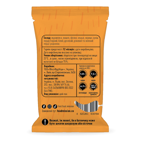 Батончик пряный 40г Food Mission.Простые, натуральные и вкусные. Батончики на основе растительных компонентов - орехов, сухофруктов и пряностей. Без сахара, сахарозаменителей и глютена. На каждый день и для каждого члена... Читать далее...