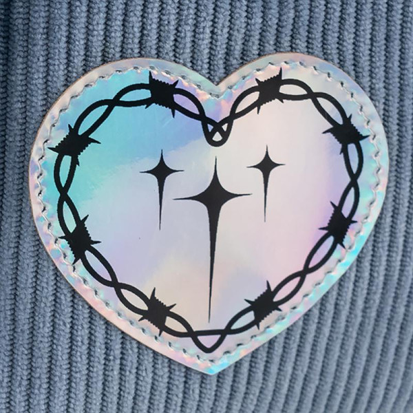 декор: вставки c вельвета, голографическая нашивка с печатью, объемный брелок-подвеска в форме сердца с пластиковой цепочкой.