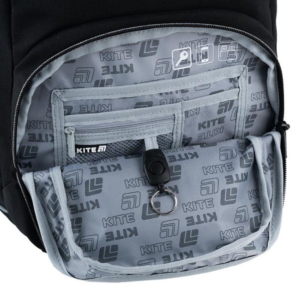 большой передний карман, внутри которого – органайзер для канцелярии, карман для мелочей и съемная ключница;