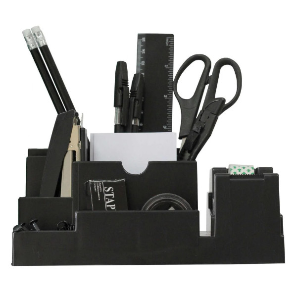 Удобный настольный набор для канцелярских принадлежностей в офисе и дома. Размеры 19,5 х 11,5 х 8 см. Пластик. Удобно, практично на рабочем столе всегда под рукой. Есть диспенсер для скотча, т.е. всегда будет под рукой у... Читать далее...