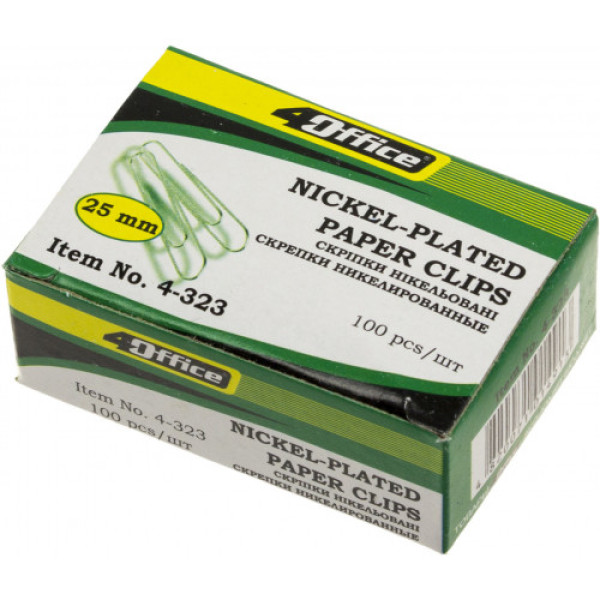 Скрепки канцелярские 4Office, металлические, никелированные. Скрепки позволяют легко и практично упорядочить документацию. Длина 25 мм, упакованы в картонную коробку по 100 штук.... Читать далее...