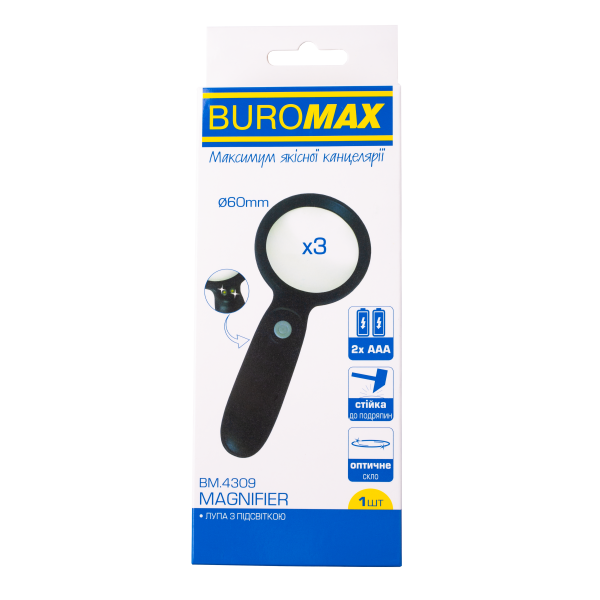 Ручная смотровая лупа (увеличительное стекло) BUROMAX – прекрасный инструмент для рассматривания разнообразных мелких деталей. Она отлично визуально увеличивает изображения, предметы, тексты. Подходит для большинства потребностей - как для профессиональных, так и для бытовых. Лупа BUROMAX не усложнена особенными конструкциями и понятна любому потребителю. Лупа оснащена подсветкой, размещенной на ручке, что помогает рассмотреть мелкие детали даже при слабом освещении.