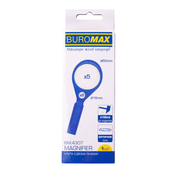 Ручная смотровая лупа (увеличительное стекло) BUROMAX – прекрасный инструмент для рассматривания разнообразных мелких деталей. Она отлично визуально увеличивает изображения, предметы, тексты. Подходит для большинства потребностей - как для профессиональных, так и для бытовых. Первое - большое по диаметру - стекло помогает рассмотреть достаточно большую площадь текста / изображения / предмета. А второе стекло - маленькое по диаметру, но большее по кратности - обеспечит сильное увеличение мелких деталей. Лупа BUROMAX не усложнена особенными конструкциями и понятна любому потребителю.