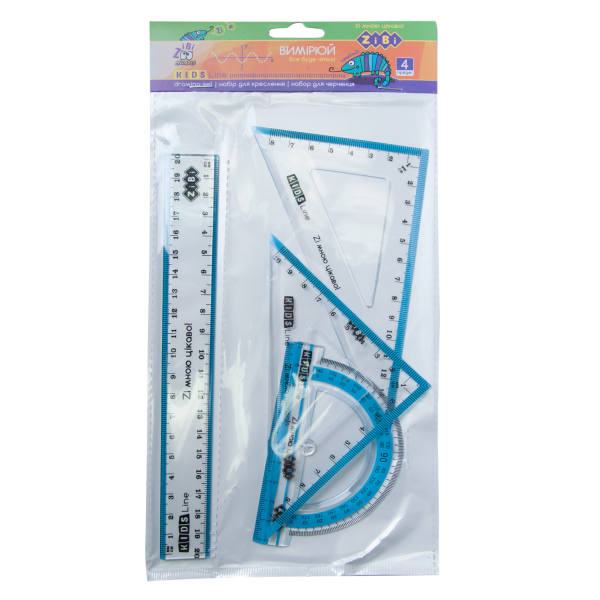 Набор для черчения из прозрачного пластика с цветными полосками.В состав набора входят1 линейка с пределом измерения 20 см и 2 шкалами, каждая из которых имеет сантиметровые и миллиметровые деления;1 угольник 90 ° / 45 °... Читать далее...