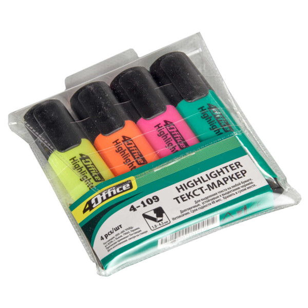 Бренд: 4OfficeТип маркера: текстовые Назначение маркера: для бумагиОсобенности: несмываемые Толщина линии: 1мм, 5 ммЦвет: разноцветныйТип пишущего узла: клиновидный...Количество в упаковке, шт.: 4 Упаковка: ПВХСтрана-про... Читать далее...