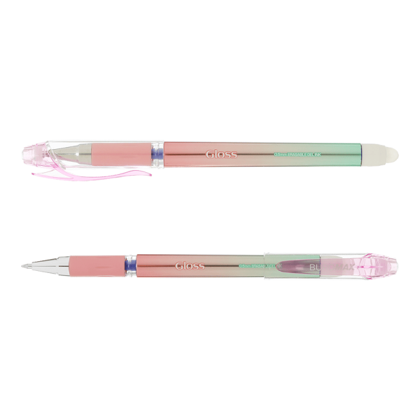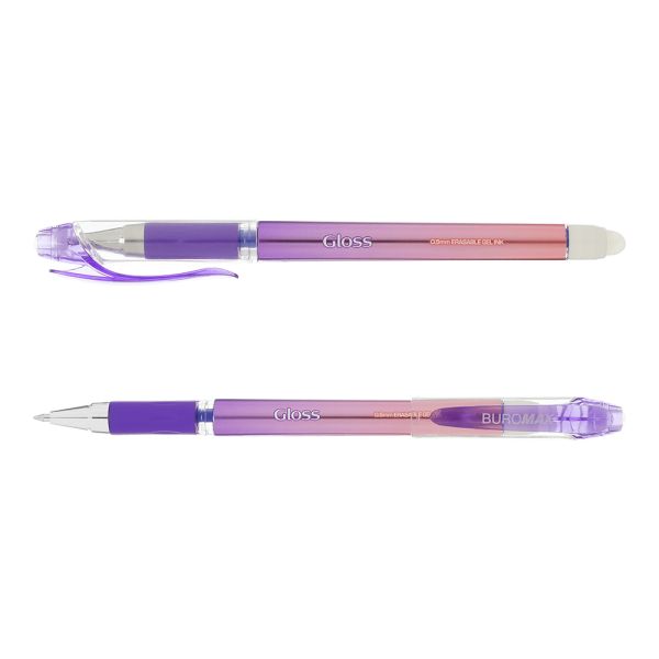 Гелевая ручка «Пиши-стирай» Gloss от BuroMax – имеет главную особенность, ее надписи можно стирать! Сделать это легко, благодаря специальному чернилу ручки и резинке, расположенной на конце ручки. Просто потрите место, которое нужно исправить, резинкой на ручке. Место нагреется вследствие трения, а чернило – исчезнет с бумаги. Все очень просто, и никакого повреждения бумаги в месте трения!